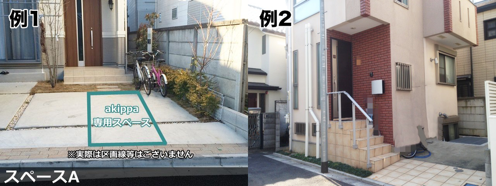 写真左、例1のスペースは杉並区成田の駐車場で玄関前のスペースを『バイク専用』駐車場として貸し出ししています。右、例2は自宅駐車場の空きを『軽自動車専用』として貸し出ししています。空きスペースがあれば設置物がなくてもこのように簡単に貸し出せるのがakippaなのです。